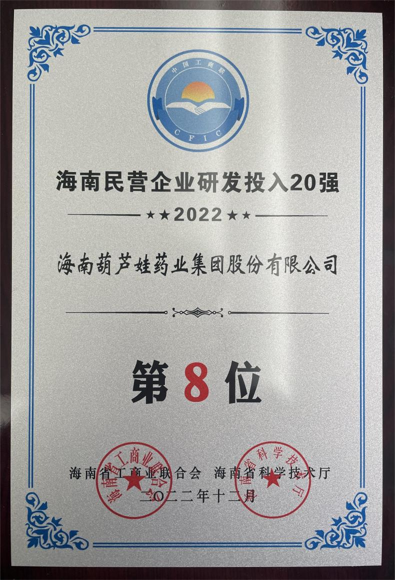 12月23日,2022海南民营企业50强和研发投入20强发布会在海口举行。会上发布了“2022海南民营企业50强”“2022海南民营企业研发投入20强”榜单和分析报告。BG视讯药业再次荣登两榜,在海南民营企业50强榜单中位列第25位,较去年上升8位,这也是公司连续三年登榜;在海南民营企业研发投入20强中位列第8位,较去年上升7位。
